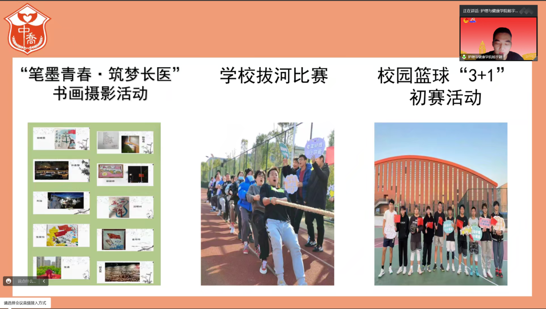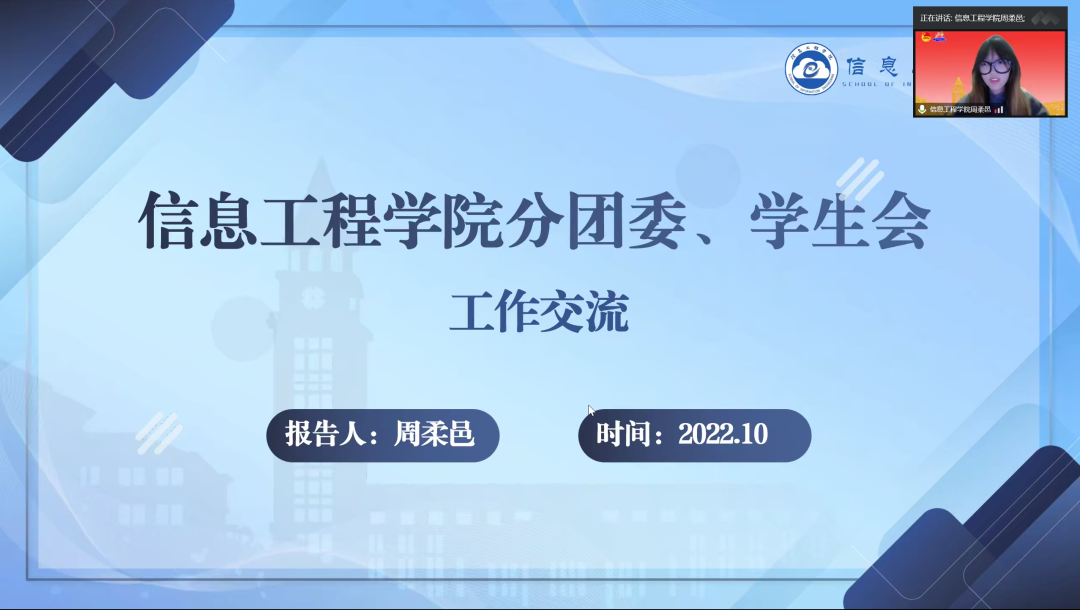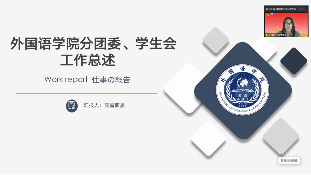 周雪昕晨同学从“我”为院风、学风、班风做建设、“我”为防疫做志愿、“我”为迎新做规划三个方面交流分享了外国语学院学生会近期工作,同时表明今后外国语学院学生会也将发挥的自身最大优势,为学校广大师生服务,秉持服务初心,将服务同学落实、落细。