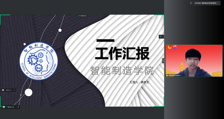 蒋孝文同学交流分享了智能制造学院学生会新近期重点工作、近期开展活动以及完成情况。同时表明智能制造学院学生会将从线上教育讲座、体育活动、寝室文化、学院同学生活权益调查工作四个方面立足本分工作,在细微处见真章,按质按量地完成学校和学院各级交办的各项工作,切实将学生会组织的温暖传递到同学心中。